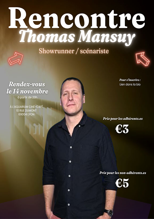 Le Septième Scénar' vous invite à une soirée exceptionnelle en compagnie du scénariste et showrunner Thomas Mansuy (Dix pour cent, Scènes de ménage, Belphégor, Les Rivières pourpres, et la prochaine série Lucky Luke). Il reviendra sur son parcours, son métier de scénariste, les attentes et les défis de la profession, et partagera avec le public son expérience, ses méthodes et ses inspirations. Rendez-vous le jeudi 14 novembre à 20h30 à l'Aquarium Ciné-Café. Une rencontre à ne pas manquer pour tous les passionnés d'écriture et de cinéma !